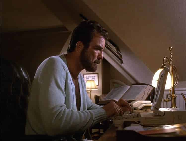 We’re continuing the theme of spy thrillers with our next writer, the mystery writer Phil Blackwood (Tom Selleck) from the romance film Her Alibi. Phil has been having a tough time of it currently, suffering from writer’s block with his latest writing efforts full of predictable plots and declining interest from the public. To cure this mental block, he attends the local court to get the creative juices flowing. He gets more than he bargains for when he locks eyes on the alluring Romanian defendant, Nina (Paulina Porizkova).