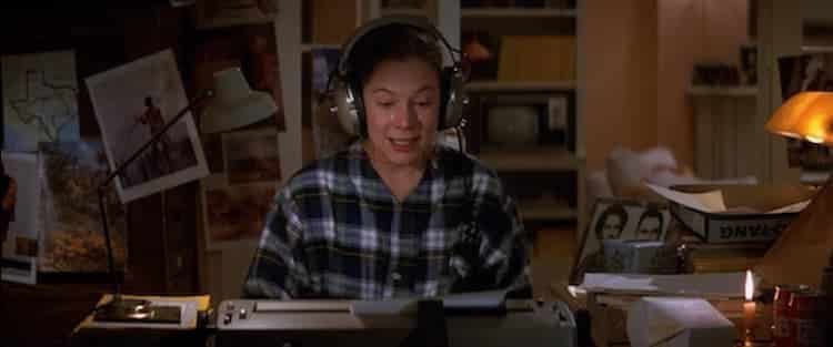 Keeping ourselves in the 1980s romance niche, we’ve got the romance writer Joan Wilder (Kathleen Turner) from the adventure film Romancing the Stone. Like many writers in films, Joan is successful, writing best-selling hit after hit, but she doesn’t have a man, so her life is a mess, according to what we see at the start of the film. She’s the atypical cat lady living in an apartment alone in New York City. Enter in some scary gangsters from South America, a kidnapped sister, and an ill-placed truck, and just like that, Joan is introduced to the love interest, Jack T Colton (Michael Douglas), and the film really gets motoring along.