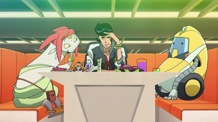 Last, but certainly not least, is this 26-episode series about a trio of alien hunters combing the galaxy for rare alien species. But unlike the bounty hunters on the Bebop, rōnin on the road, and criminal cruising through Diamandra, these three make a living by more conventional means: they capture new creatures to log at the Alien Registration Center. The “Aloha Oe” crew consists of the pompadour-sporting Dandy, robotic QT, and suspiciously feline-like Meow (real name Mymyamo, but nobody else can pronounce it).