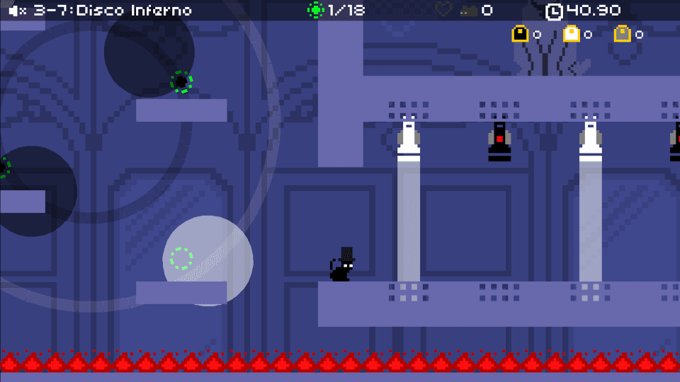 Some collectibles are put in tough spots requiring multiple midair phase shifts. I dare you to try to get all the charms on 3-6 – the level called “Curtains,” it took me 25 attempts but I never felt like “I can’t do this,” even though I was failing and having to restart. The game can pull me into a hypnotic state where I just keep playing until I accomplish my goal without ever becoming overly frustrating. The sense of triumph when you nail that perfect run and find hidden collectibles scattered across each level is nothing short of the thrill “larger” indie projects like Celeste gave me.