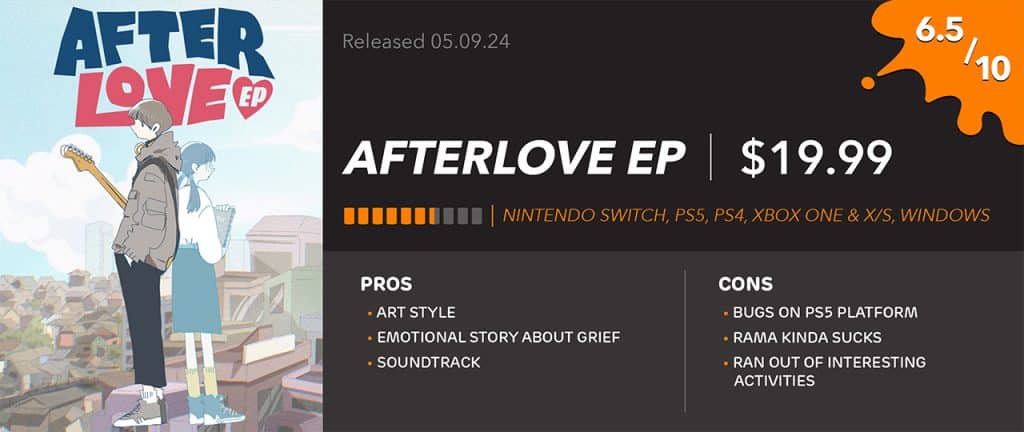 I played Afterlove EP on PlayStation 5 and had a few issues with bugs. There were times where Cinta’s dialogue bugged out, and only a half-second played before skipping to the next line. There are times when you have to reply to text messages, and sometimes, the ability to reply wasn’t there, so I had to restart the day to reset it.