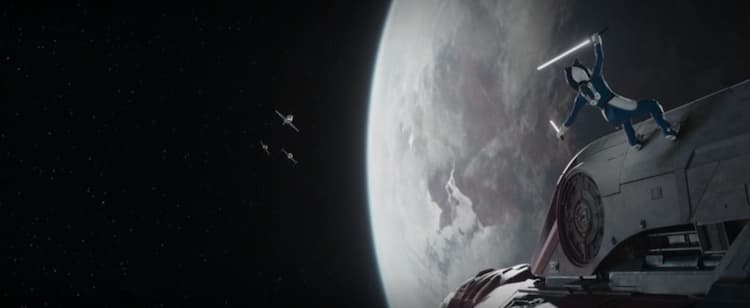 Ahsoka draws her sabers in open space and prepares for the incoming fly-by from the apprentices. The first volley hits the ship, but Ahsoka manages to deflect some of the blaster bolts. On the second run, she DESTROYS ONE OF THE SHIPS! She’s so freaking cool!