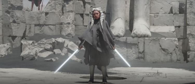 Ahsoka arrives at a temple ruins, looking pensive and inquisitive. Not an inquisitor. Inquisitive. She finds no entrance, so she makes her own, throwing her two white lightsabers into the ground and rotating, carving a circular entry. She lands gracefully inside. This temple doesn’t seem to be Jedi, nor does it feel Sith-y evil… interesting.