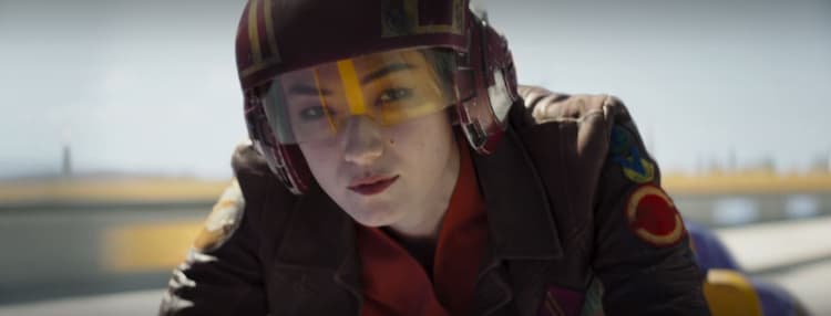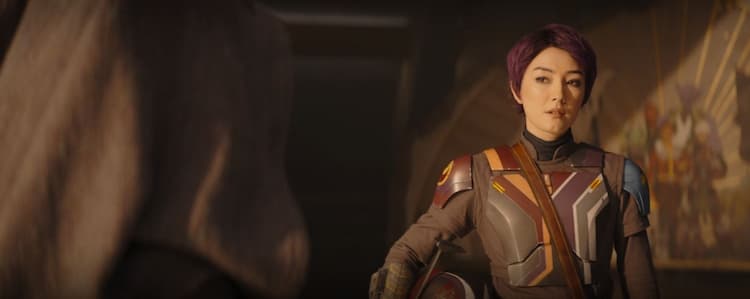 Lothal bossman Governor Azadi (Clancy Brown) unveils a mural as a celebration of the victory over Thrawn by the Rebels. If you’ve seen Star Wars: Rebels, you’ll have seen this art before. The special guest for this unveiling is none other than Commander Sabine Wren (Natasha Liu Bordizzo). Applause. Sabine? Where you at?