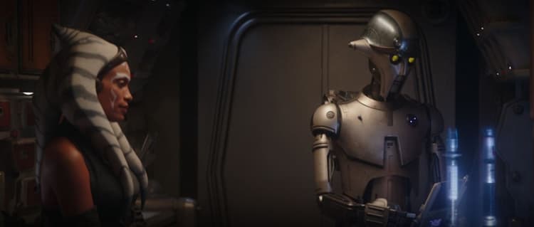 Ahsoka searches Sabine’s home methodically until the incapacitated droid drops from the ceiling by surprise. My surprise, not Ahsoka’s. She swiftly decapitates the droid, taking the head with her.