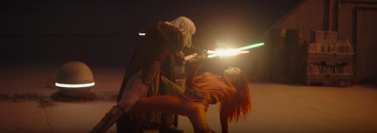 Big mistake. These ain’t no Jedi. The apprentice, Shin Hati (Ivanna Sakhno), starts a-swinging, slaying innocent New Republic personnel. The swings don’t seem to connect all that well, but they all die, so it must have been close enough. Baylen Skoll (Ray Stevenson) kills the captain and proceeds to the brig. Baylen has his Darth Vader corridor massacre moment (super cool) and then frees Elsbeth.
