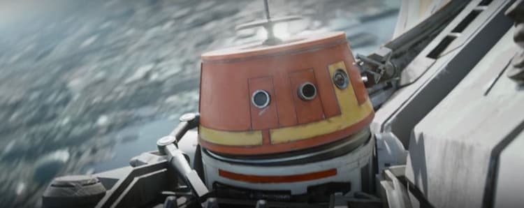 Hera pilots The Phantom, chasing the hyperdrive-carrying ship. Hera orders Chopper to ready a tracker beacon. Chopper can’t find the tracker and, like a sassy madam, claps back at Hera, asking if she’s messed with his stuff. He eventually finds it and shoots. AND SCORES! The tracker attaches to the ship. Mission accomplished.