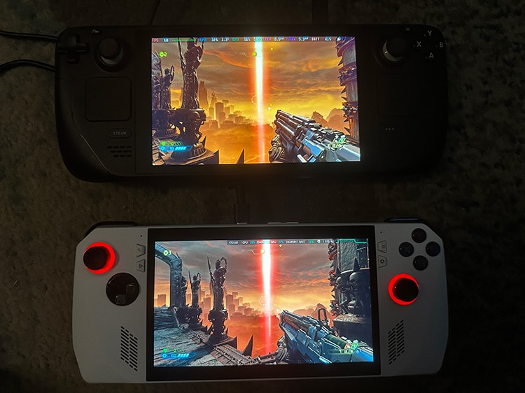 Between the Steam Deck and the Extreme version of the Ally, Performance seemed very comparable, damn near identical. However, the difference in resolution and frame rate were noticeable. Using Doom Eternal as a reference point, I played the same stages on both systems and did side-by-side comparisons of the same part of the level. The Ally had a noticeably better picture with the 1080p IPS screen, and the frame rate was pushing up over 100 fps, whereas my LCD Steam Deck was capping out at around 58 – 59 fps, and the image seemed squished to the smaller 1280 screen.