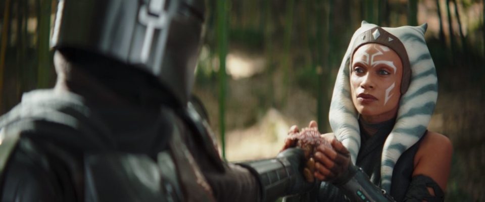 “If you are set on it, then allow me to deliver it,” Ahsoka offers a compromise. “I came all this way. He’s right there,” Din wants to reunite with Grogu. It’s not just about the Mandalorian right as a foundling. Ahsoka approaches and places her hand on his shoulder, “Grogu misses you a great deal. If he sees you, it will only make things more difficult for him.” Djarin looks on for a moment. He turns to Ahsoka, “Make sure he’s protected,” handing over Grogu’s right.