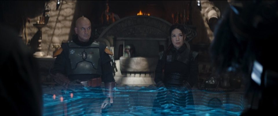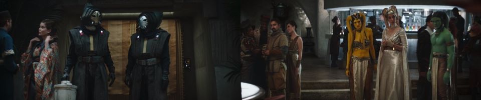 Boba Fett, (There he is!), with the Mods, Krrsantan, and Fennec Shand gather around a holo map of Mos Espa for a meeting, “The Pyke Syndicate has been gathering soldiers the last few weeks. Mayor Mok Shaiz is on their payroll and has flown off-world, which leads us to believe the storm is about to break,” Fennec circles around the map, explaining the current situation. Mok Shaiz’s majordomo approaches and corrects her, “It was a scheduled vacation, actually.” Fennec gives him a dirty look and continues, “Here’s a map of where they are gathering, based on whispers. The three crime families of Mos Espa seem willing to lay low and let the Pykes move on our territory,” she turns to acknowledge a new presence in the throne room. “This is the Mandalorian, Din Djarin.” He nods at Fett, and Fett nods back. “Thanks to him and Krrsantan, we now have enough experienced muscle to act as enforcers. The Mods have done a thorough job of surveying the streets, but we lack the numbers to cover our territory if an all-out war comes. We need foot soldiers.” “I might be able to help with that,” Djarin offers, prompting a surprised turn from those in the circle around the holomap.