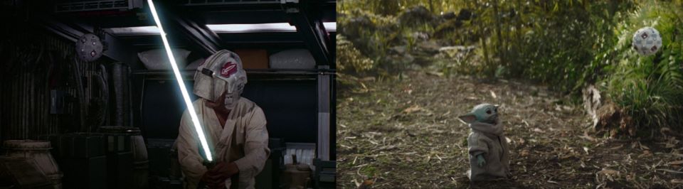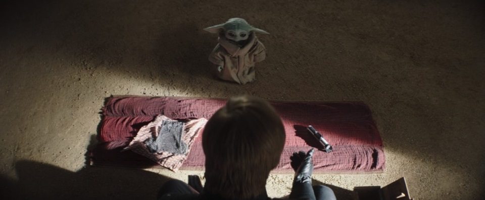 The main building of Luke’s Jedi Academy has been completed. Luke sits cross-legged from Grogu with a maroon cloth set between them. Luke places the orange and white kerchief on the maroon cloth to his left and unwraps Din’s present for Grogu: It’s a small chainmail shirt made from Beskar. “The Mandalorian wanted you to have this.” Grogu gets up to go to his new present, “But before you take it, I will give you a choice. This is a lightsaber.” Luke ignites the blade, and Grogu makes little excited breathy noises in anticipation. “It belonged to my teacher, Master Yoda. And now, I’m offering it to you,” he places the lightsaber on his right with his gloved hand.