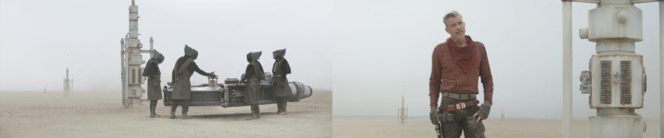 Cobb Vanth walks out into the middle of Freetown’s street to square off with the visitor. The townsfolk head inside, as deputy Scott steps outside, “What’s going on, boss?” “Let me handle this, Deputy,” Vanth doesn’t want the amateur adding any extra distractions. “I’m not leaving you out here alone,” Scott stubbornly refuses. The stranger approaches and squares off, “Cobb Vanth,” the newcomer says in a dry, gritty, distinctive voice. “And who might you be?” wonders Vanth. “Whatever Fett is paying you, we’ll match, and all you’ve got to do is stay put and let things play out,” keeping his head low and eyes obscured. “Hey, the Marshal ain’t for sale,” the deputy unhelpfully offers from the sidelines. Vanth gives him an incredulous look.