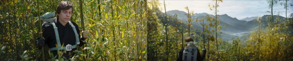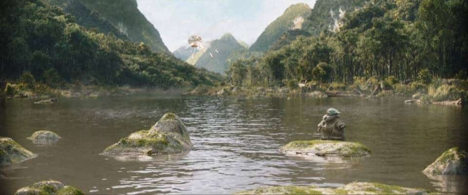 Luke takes Grogu for a run in the backpack through the bamboo forest, reminding us of the days he trained with Yoda on Dagobah. “Hang On,” he does one of his signature flips. Luke jumps out on what appears to be a rock but is really some kind of water buffalo boar. He jumps from rock to rock, makes his way back to the forest, and climbs a tall bamboo stalk giving them a view of the valley and river below. “Look. The wide world exists in balance. Feel the Force all around you.” They close their eyes in meditation. Luke’s theme song plays. “Through the Force, you will find balance as well.”