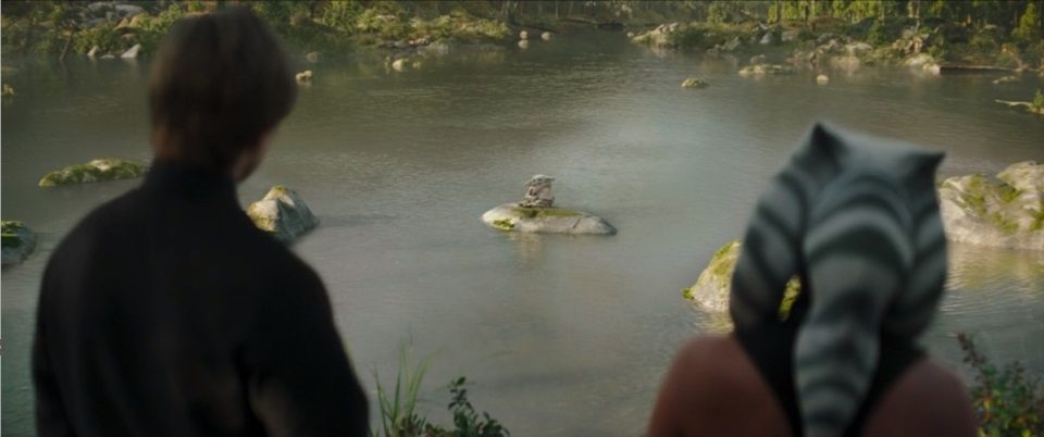 Grogu’s training progresses. He’s a fast learner. He leaps from rock to rock into the river, dodging the training remote shots. He adorably jumps and scurries away as Luke watches from the shore. Ahsoka joins Luke. She has the orange and white kerchief in her hands. Grogu seems to tire of his training, and Force focuses on the training remote, crushing it. It explodes, falling into the river. Grogu squeals happily at his accomplishment.