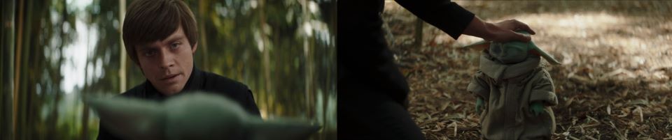 “All right, let’s go for a walk.” Luke gets up, and little Grogu follows. Luke lets him walk independently but uses the Force in an arcing sweeping motion to help Grogu keep pace with him. “I want to tell you about someone you remind me of a great deal. His name was Yoda. He was small like you, but his heart was huge, and the Force was strong in him. He once said to me, “Size matters not.” That’s how he talked. He would speak in riddles. Have you heard anyone talk like that back home? Do you remember back home?” Luke pauses, and his face gets intense, “Would you like to remember? Let me help you remember.” Luke places his hand on Grogu’s head. Grogu seems apprehensive at first, but then his little ears droop as he tries to remember with Luke’s help.