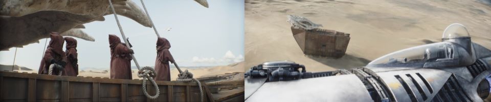 Djarin makes his way across the desert in the N-1 fighter on his new quest. He spots a Jawa Sandcrawler with the skull of the Krayt dragon mounted on top, acting as a sunshade canopy, and circles it. In The Mandalorian Chapter 9: The Marshal, we see Djarin’s battle with the Krayt dragon with a number of unlikely allies taking down a large communal problem. It seems the Jawas laid claim to part of it as a trophy. Djarin has been making a lot of waves out in the Dune Sea with his recent adventures. The Jawa’s recognize his ship since they have helped bring in rare parts and excitedly point and wave as he flies away. You always remember a good tipper.