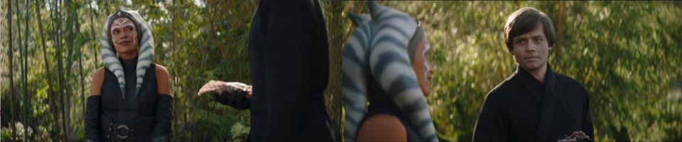 She leads him away from the unfinished temple back through the bamboo forest. Djarin checks to see if R2 will be following. R2 stays put. “I warned you when we met that your attachment to Grogu would be difficult to let go of,” she reminds him. “He was a Mandalorian foundling in my care. I just want to make sure he is safe,” Ahsoka can see through that simple reasoning knowing Din’s attachment to Grogu. “There is no place in the galaxy more safe than here with Luke,” she makes a strong point. “I don’t understand why you’re all right with Skywalker’s decision to train the kid when you wouldn’t,” Djarin is still trying to understand the ways of the Jedi. “Because it was his choice. I don’t control the wants of others,” Ahsoka did not want to take Grogu on as a padawan, but Luke is eager to start a new Jedi Academy and rebuild the Order. “Then, it’s my choice to go and see him,” determined to not let Ahsoka stand in his way. “Of course. If that is what you wish,” she looks off to the hill with the short tree with Luke and Grogu in the distance.