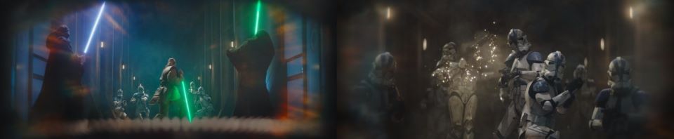 Grogu’s force memory is portrayed differently from Boba Fett’s dream memories. When we were getting a glimpse of Fett’s past, they were through his dreams which would transition from a slightly hazy filter overall before clarifying we had taken a step back in the timeline. Grogu’s memory vision was consistent with the warm Jedi vision filter of the haloed fish eye lens, where the vision is focused briefly on specific people and events in time.