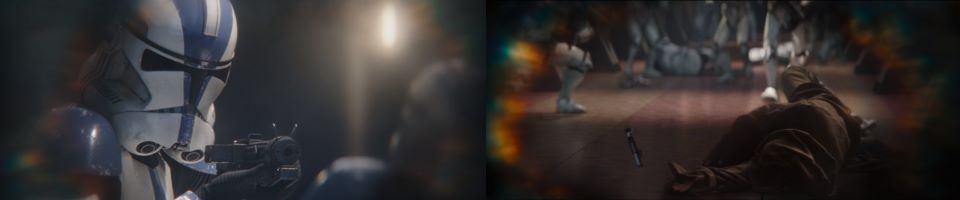 Grogu is wide-eyed tucked into blankets. Three Jedi stand their ground against a Legion of 501st clone troopers during the siege on the Jedi Temple during Order 66, 28 years before. The lead Jedi wielding a green lightsaber gets shot down first, the other two Jedi fall shortly after. One of the clones blasts the downed Jedi, ensuring the job is done. The 501st move in toward Grogu as we come back to the present.