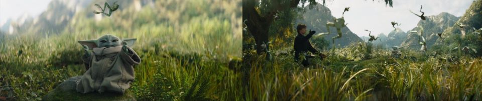 Tranquility. A peaceful view of the bamboo forest. A hill with a short tree shading a Jedi and his new pupil. Grogu sits opposite Skywalker, who is wearing the familiar black Jedi robes we have seen him in Episode VI: Return of the Jedi. Both are meditating when Grogu breaks his concentration as a frog leaps into view. He tries to go back to meditating but pops one eye open, tracking the frog as it leaps into a small pond.