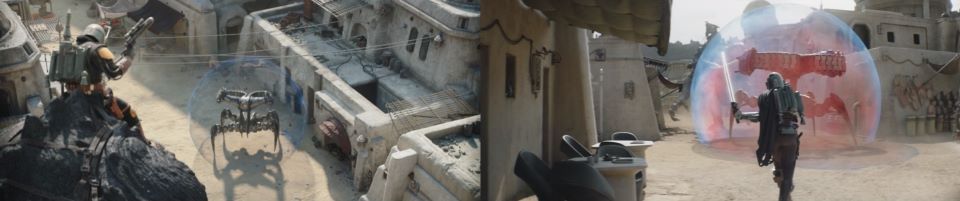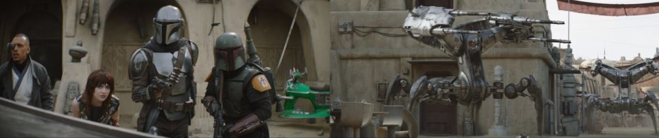 “They’re falling back,” Taanti, the Weequay, exclaims. A cheer rises from the fighters. Fett, Djarin, Drash, and Skad hesitate to start the celebration. Djarin edges up to the front and presses a button on the side of his helmet, changing his HUD, heads up display, to thermal. There is a large droid just out of sight around the corner. “I wouldn’t celebrate yet. We got problems.” The massive Scorpenek droid plods along on its four legs, slowly closing the distance. Another droid appears from the same street Krrsantan arrived from, doubling the trouble the fighters are about to face. “We got real problems,” Djarin affirms. As the two massive droids get into position, everyone braces in preparation. Both droids ignite their circular shields, their design reminiscent of the Droideka on steroids.