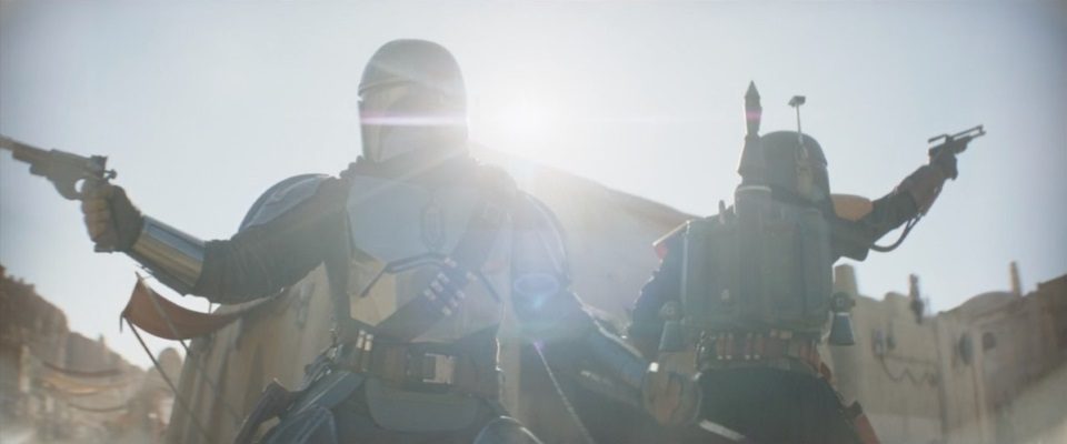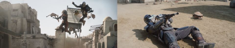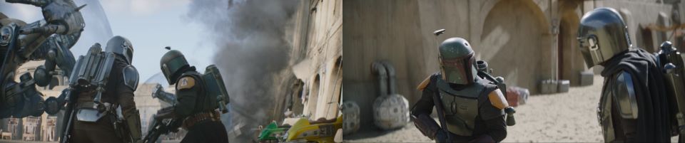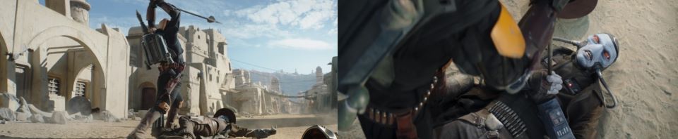 “They just keep coming,” Fett says. A sniper Pyke lands two shots on both men’s backs, getting their undivided attention. Both turn simultaneously and, in unison, repeatedly blast the baddie from his perch. Fett and Djarin start taking more hits to their beskar armor. The Pykes swarm in and keep up their barrage which continues until both men take a knee again. They are now getting peppered with an onslaught of shots, so neither can recover enough to get up and fight back.