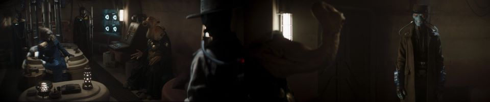 Jawas scrounging for parts at night see a stranger pass and quietly whisper to each other in Jawaese. Cad Bane makes his way through the streets entering the Pyke stronghold. Mok Shiaz, the Mayor of Mos Espa, is rambling on about the recent developments within the city. The Pyke leader stops Mok Shiaz and addresses the new arrival, “You returned so quickly. Was your venture successful?” “You won’t have to worry about Freetown,” Bane says confidently. “Did you convince the Marshal to remain neutral?” asks Mok Shaiz. “Yes,” Bane draws out the word.
