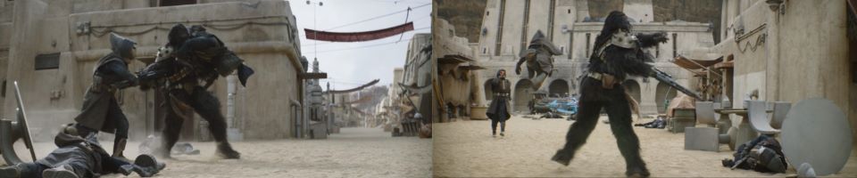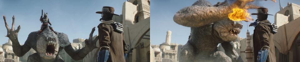 Cad Bane hasn’t left Mos Espa. He stalks out into the main roadway from a side street. The rancor smashes another Pyke into the ground with its fist. Bane approaches the beast, and it charges Bane. Bane put his arm out, activating his flamethrower. The flames stop the rancor in its tracks, the heat too intense for it to push through. It bucks Fett from his perch, and Fett falls to street level. Bane uses the flamethrower again to dissuade the rancor from further advancing. The rancor is riled and keeps roaring its discontent as it leaves Fett and climbs over the surrounding buildings, getting distance between Bane and itself.
