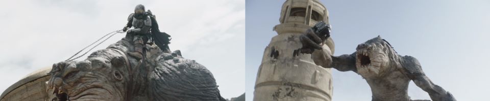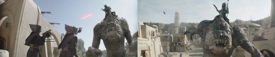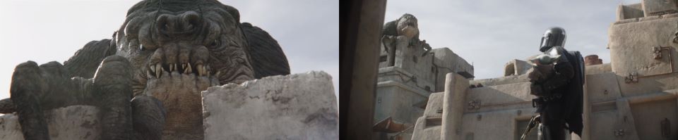 Djarin grabs the chain reins and swings himself around to mount the beast. The rancor is not having any of it. He grabs Djarin from his back and throws him down to a roof below, jumping onto that same roof and pummeling Djarin into the building below. The rancor grabs Djarin from the interior of the building and roars, lifting him high up in the air. The rancor knows this is not his imprinted human. Similar armor, different man.