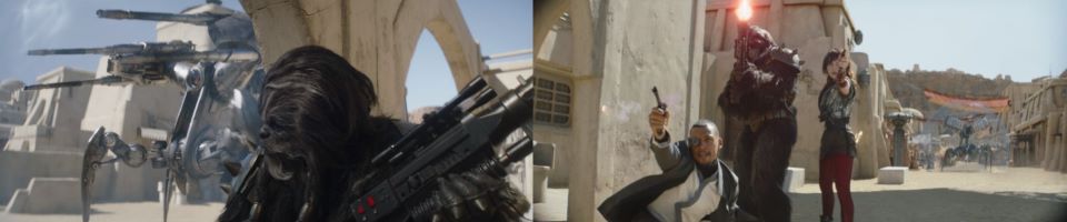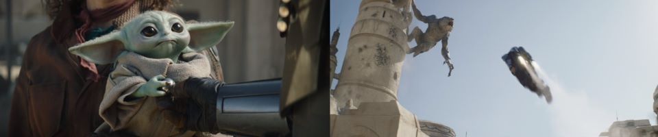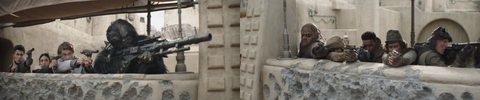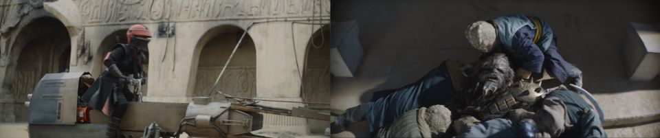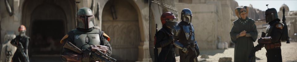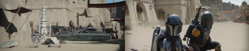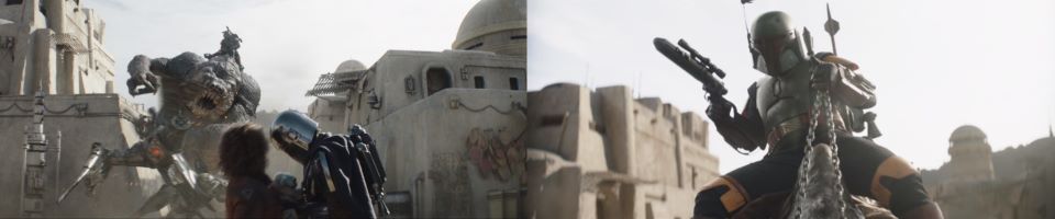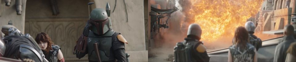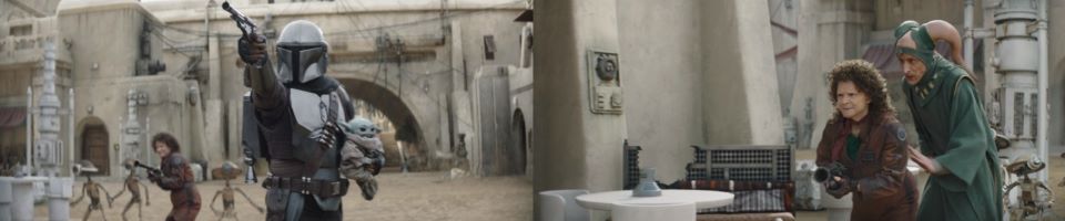Djarin appears, running around the corner, blasting at the remaining Pykes, holding Grogu at his side, Peli not far behind, “Keep ‘em on their heels. They’re on the run,” he signals to the fighters who continue to celebrate with smiles all around. The fighters taking his advice disperse, chasing after the Pykes through the streets of Mos Espa. Drash and Jo taking shots from above, Fett at the far end of the street is still mounted on his rancor. Grogu stoically takes in the scene, secure in Djarin’s grasp.