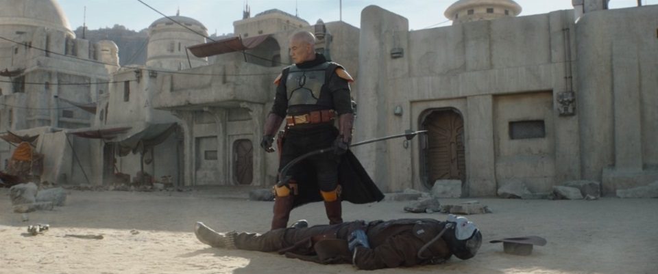 Blaster shots are exchanged in the streets, and it’s clear the odds have shifted. The shooting ceases. “I’m sorry about the Marshal,” Djarin says to Taanti. “They gunned him down in cold blood,” explains Taanti. “You didn’t have to come here,” Djarin says. “Yes, we did. This planet deserves better,” Taanti is convinced.