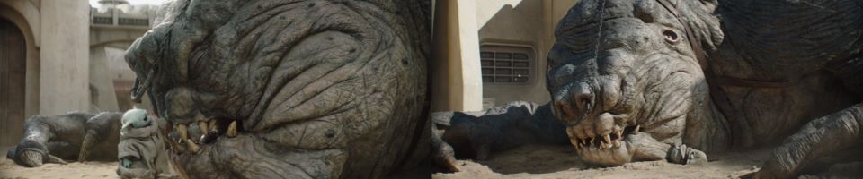 There is an echoing roar in the distance, and silence follows. Djarin and Peli duck into a structure. The citizens of Mos Espa wonder what that noise could be. Loud footsteps can be heard pounding through the city in a steady cadence. Two giant claws grasp the edge of a building as the beast pulls itself into view. Djarin looks on as he is holding Grogu. The rancor! Once again, it roars in the midst of the city. The citizens cower in fear, never seeing anything like this roam their streets. The Scorpenek droid forgets about Djarin and Peli and starts aiming at the rancor.