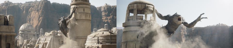 The Pykes are continuing to retreat with the fighters on their heels. The loud roars of the rancor echo through Mos Espa. “The rancor’s on the loose!” the Weequay notices the beast without its rider. The rancor starts teething on a speeder. The fighters start taking potshots at the rancor, trying to herd the beast, making him angry. He hurls the speeder in their direction, frustrated that the fighters don’t understand its need to explore. “You’re scaring it! Put your blasters down! Stop shooting!” Djarin waves the fighters off, understanding this only adds to the chaos. The rancor starts climbing one of the towers in Mos Espa, King Kong style; when it gets to the top, he starts tearing down the spire.