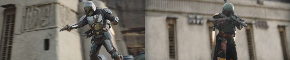 Djarin notices one of the Pykes trying to surround them from behind, and he does a spin to get in place back to back, with Fett taking that Pyke down in the process. One of the sniper Pykes gets a shot in on Djarin on his left pauldron. It rocks him a bit, but he remains standing. Fett sees another Pyke taking aim at Djarin and goes to cover his flank. Djarin again is rocked by a shot to his left pauldron, taking a knee, while Fett covers him unloading blaster bolts in two more offenders.