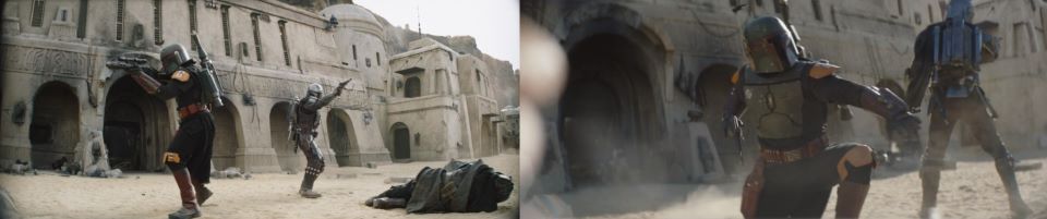 The Pyke slowly starts aiming his blaster at the majordomo. “His words,” the Twi’lek reminds the Pyke. The lead Pyke gets shot down by a blaster bolt from above. Fett is on the offense using the majordomo’s attempt at negotiation as a diversion. Using his jetpack to elevate himself, he gets a clear overhead shot of the Pykes assembled on the street. The Twi’lek retreats back to the Sanctuary. Djarin makes his entrance via jetpack from the left of the Sanctuary, joining Fett in an aerial display of raining blaster fire from above. Fett and Djarin pick off a few more Pykes as they make themselves difficult targets while airborne, Fett on the right, Djarin on the left. They both land in front of the Sanctuary.