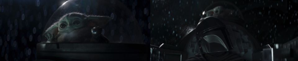 As the camera pans to the blue Tatooine sky, Din Djarin and Grogu are off on another adventure in the N-1 starfighter. Peli Motto made a good call at modding out the astromech port for Grogu. The little guy is happily content in his bubble with his lever knob toy. He taps the knob on the domed viewport. “No,” Djarin says to him. Grogu keeps tapping. Din tells him no two more times. Grogu insistently keeps tapping. Finally, Din gives in, “All right. But this is the last time.” He pushes the button for the sublight thruster, which catapults them forward at a much higher speed. Grogu loves this new feature on the new ride.