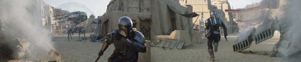 Djarin runs past both droids in the opposite direction, blasting them, hoping to get both to follow him instead of pursuing the retreating fighters. One of the droids clears a shot near Djarin, sending him flying. He rolls out of the tumble, getting in cover behind the wreckage of the armored speeder. He steps out of cover, blasting one of the droids intending to get its attention. It starts to swivel, and he runs off for further cover, making sure he’s leading it away.