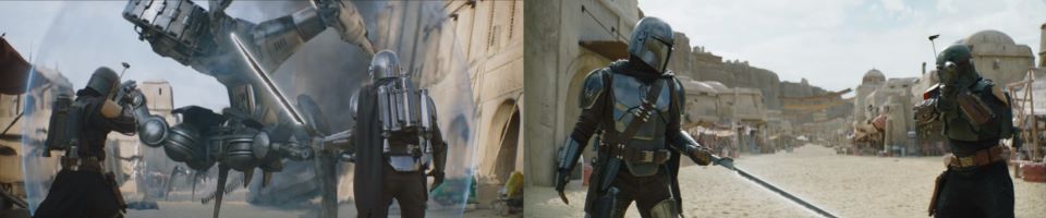 The droid slowly swivels its guns to face Djarin while the second droid takes notice and starts getting into place as backup. Djarin sees he will be sandwiched between the two and uses his jetpack to jump over the droid to be on the same side as Fett. Djarin puts his blaster away and takes out the Darksaber. It’s still cumbersome for him as he ignites it. The blade ricochets off the shield as he takes an overhead swing. He better be careful of the kickback. He swings a second and a third time, “I can’t get through.” The droid slowly readjusts and starts taking shots; Djarin and Fett sidestep further out of the way, “These two will destroy the whole city!” Fett is trying to protect Mos Espa, not reduce it to rubble. “Our energy weapons can’t get through, and our kinetic weapons have too much velocity,” Djarin explains.