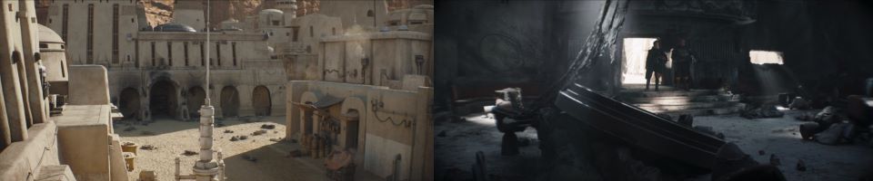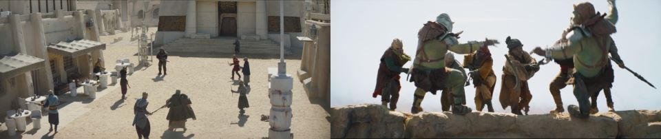 “It’s a coordinated attack,” Fett declares as he, Fennec, Djarin, and the majordomo head back into what’s left of the Sanctuary, “We’ll have to gather our people.” “There’s no way to overcome their advantage,” Fennec points out, “We need to take out command and control.” Fett turns to the majordomo, “Does the Pyke Syndicate still operate out of Mos Eisley?” “Oh, it’s difficult to say for certain that,” the majordomo starts stalling. Fennec cocks her blaster aggressively. “Mos Eisley? Yes, now that I think of it, indeed they do. More specifically, the Desert Survey Office,” the majordomo keeps singing like a Yuzzum. “Can you do that? Can you get there in time?” Fett asks Fennec hurriedly. “Worth a shot,” she turns immediately and exits the Sanctuary, jumping on a speeder bike and heading off to her new target down the now abandoned streets of Mos Espa.