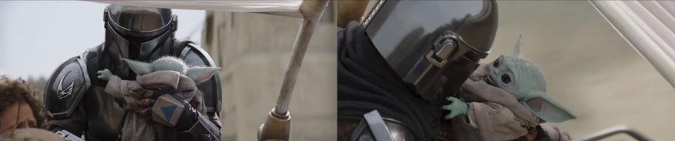 “Hey, Mando! Look who’s here,” Peli calls back to Djarin, who is still riding on the back of the chair, pulling a blanket off her small passenger. “What?” Djarin gasps and does a double-take when he sees Grogu, “Hey, what are you doing here?” Grogu Force jumps toward Djarin to hug him. “Okay, little guy. I’m happy to see you too. I didn’t know when I’d see you again,” despite their precarious situation Din, is genuinely relieved to see Grogu. Grogu won’t stop smiling at Din. “It’s okay. I missed you too, buddy.” Grogu reaches out and touches his helmet. “But uh,” cutting the sweet moment short, ”we’re in a bit of a bind here right now. You be careful. You keep your head down. You stay hidden until the fight’s over,” Djarin instructs Grogu as he places him back into the safety of the seat next to Peli. “Hey, that’s the shirt,” Din notices Grogu is wearing the beskar chainmail, “You got the shirt,” Djarin sounds as if he didn’t believe the Jedi would give Grogu his foundling right.