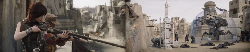 The remaining shielded Scorpenek droid continues its barrage against the fighters, chipping away at the only wall standing between them and certain death. Each side keeps taking casualties. The droid readjusts and charges its attacks while the fighters brace for impact. Drash and Jo make it to the roof and take up sniper positions. “We make our stand,” the Weequay calls to the Freetown fighters. All the fighters raise themselves, so they’re all looking over the edge of the wall at once going on the offense.
