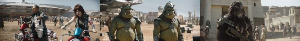Three younger teens run over to offer them some fruit. Fett, smiling, takes a Meiloorun, “Thank you.” Hera Syndulla from Star Wars Rebels is fond of this fruit. The teens runoff and he turns again to Fennec, “We are not suited for this.” “If not us, then who?” she is starting to come around to his original aspiration of taking care of the people. So far, they’ve done a pretty good job at standing their ground and ridding Tatooine of a horribly corrupt organization. Krrsantan and the Mods join them, Fett throwing Krrsantan the Meiloorun fruit. “So, the Wookiee gets a melon, and we don’t?” Skad jokingly says. “Krrsantan, you want to share?” banters Fennec. He roars at Skad. Nah, that’s his melon.