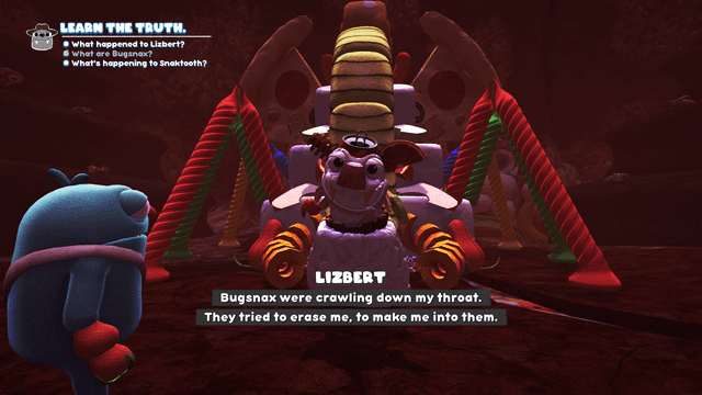 As I fell into the depths of the Undersnax, I met the horror villain to end all horror villains – Elizabert! Or, if you’d prefer a more horror-esque title – The Queen of Bugsnax! Her creepy cake-hydra appearance very quickly brought me up to speed on the true nature of the seemingly innocent Bugsnak. They were never really wildlife, or pets, or food… they were parasites taking over the body of any grumpus that chose to eat them! A change in a body part after consuming a bugsnak was not a simple little side effect, it was actually the bugsnak starting to take over the grumpus.