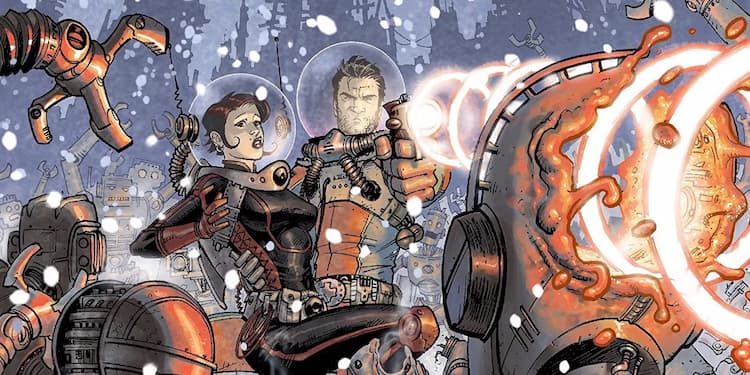 Fear Agent was one of the most surprising finds for me over the past couple of years. On the surface, it looks like your average early 60s retro-futuristic science fiction about space travel, aliens and laser guns blazing. By the time I’d gotten onto volume two of the series, we’d been introduced to Heath Huston, a space bounty hunter traveling the galaxy surviving off wit, guile, and alcohol. So far, so standard, but I loved the art and enjoy myself some pulpy sci-fi, so I picked up volume two.