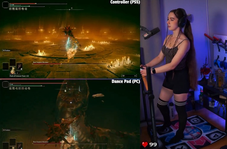 But perhaps her biggest achievement is destroying the base game while playing simultaneously on controller AND Dance Pad. The concentration and multi-tasking skills are unbelievable. I saw her take down Malenia, the boss known to make even the best players cry, and it was mesmerizing.