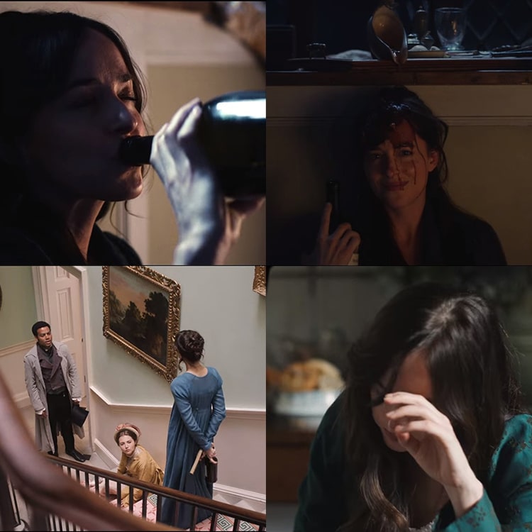 As I stated earlier, in the novel, Anne Elliot is modest, compassionate, kind, and has a good grasp of propriety. Austen’s Anne would have never taken a bottle of wine to drink by herself nor from the actual bottle. And yet she does this several times in this adaptation. She even becomes so intoxicated that she dumps gravy on her own head. Another time she visibly complains of a hangover after one of these binges.