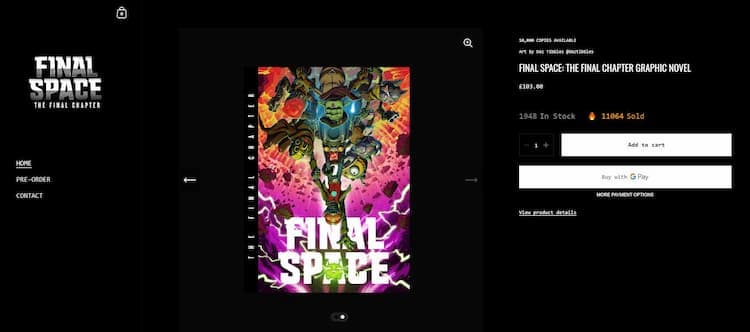 Olan listed a pre-order of the graphic novel at https://finalspaceends.com/, soft-capped at 10,000 units, listed at $125 each plus a delivery charge. A pre-order that won’t be fulfilled for at least 12 months.