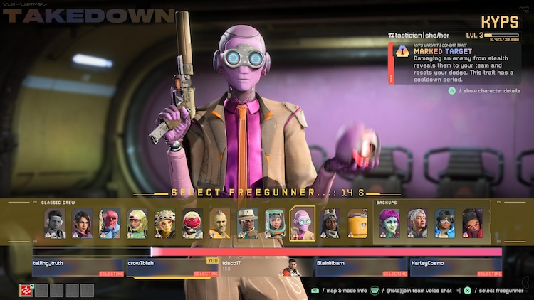 The characters were pretty cool, and the designs varied. I vibed with three the most: Kyps, the stealth ninja robot who can cloak herself and can set up sensors to reveal enemies on the map; It-Z, a cat-like alien creature who is hella fast and can teleport; and Teo, the generic sci-fi army man like Hicks from Aliens. What’s also interesting is you will be able to unlock variants of each of the 16 available heroes from launch, which will give them different special abilities and allow you to customize the squad you take into a match.