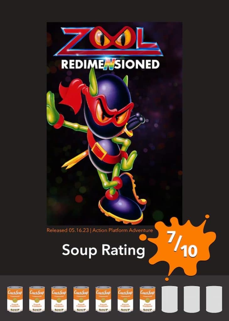 Zool Redimensioned is a fun 2D mascot platformer reminding me of great times taking turns playing with my sister on my dad’s computer. The Chupa Chups game (Zool was sponsored by Chupa Chups in the 90s, but all references were removed in the game’s port) was not perfect then, and it’s not perfect now, but Redimensioned has made Zool more playable than ever with great quality-of-life features and an added multiplayer mode. It may not be your game of the year or even one you play for an extended period, but at $9.99, it’s definitely worth a try.