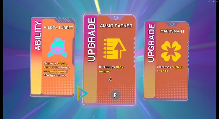 The game’s progression is classical for its genre. You wipe out two waves of enemies within a room, and you get an upgrade and the chance to move on to another room. After three rooms, you face a boss. There are five bosses in the game, and you’ll always face them in the same order. If you’re able to survive the gauntlet and beat the 5th boss, congrats, you completed the game on that run.